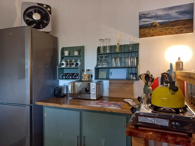 The spacious Lavender Cottage is designed for 2-4 guests, offering a comfortable and well-equipped self-catering experience. It features a separate bedroom with a queen-sized bed, a bathroom with a shower, and a fully equipped open-plan kitchen. The cozy living area includes WiFi and a cozy fireplace, while an additional single bed and loose mattress in the lounge make it ideal for small families.