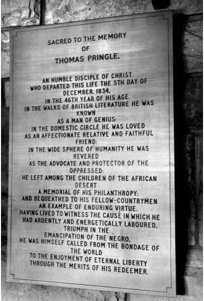 The Pringle family still lives on the farm in Baviaans River. After his family was settled, Thomas moved to Cape Town where he worked at the newly created South African Public Library and pursued his writing career. To supplement his small income, he opened a school with a friend from Scotland and in 1823 started a newspaper, the South African Journal, and a magazine, the South African Commercial Advertiser. He and his staff published editorials advocating reforms of the British colonial system. After both publications were censored by the government, Thomas resigned. His reformist views also led to the failure of his school. He resigned from the library and returned to his family’s property in 1824 however he continued to fight for the freedom of the native people. Eventually the harsh conditions took their toll and he and his wife returned to London around 1826 in financial ruin. Thomas’ work in South Africa attracted the attention of the British Anti-Slavery Society and they offered him a job as secretary, a job that suited him perfectly.