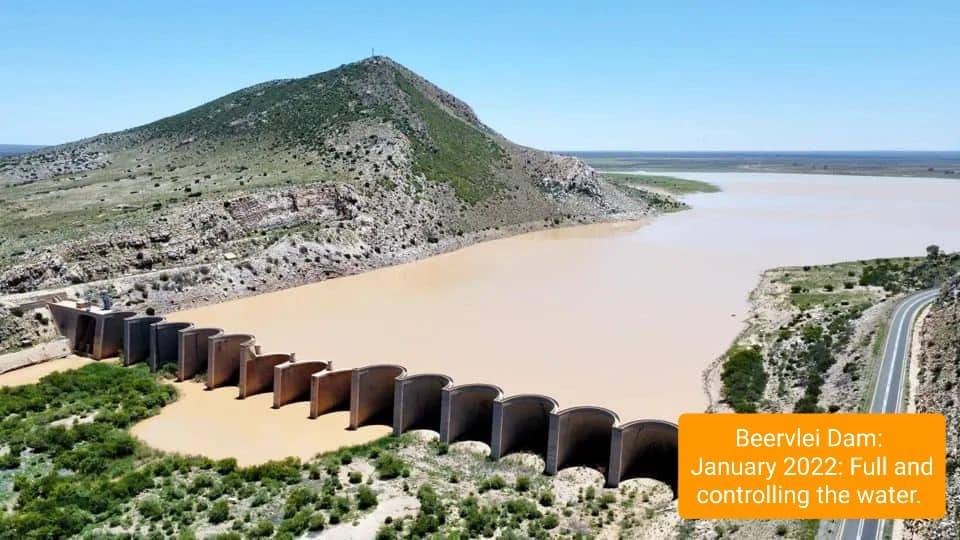 Motorists traveling along the N9 from the interior via Graaff Reinet and Aberdeen towards Willowmore would notice a huge empty dam on the right. It’s not empty because of drought though. The Beervlei Dam is supposed to be empty. The dam was completed in 1957 as a flood control dam to help protect areas downstream on the Groot River when good rains do happen. The Karoo sediments in the area contain a lot of salts and it has been found that lengthy storage of water results in high water salinity, so the dam doesn’t supply any town with water. Any flood water would be used as quickly as possible by the downstream irrigators and the reservoir is kept empty for extended periods.