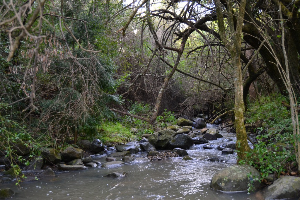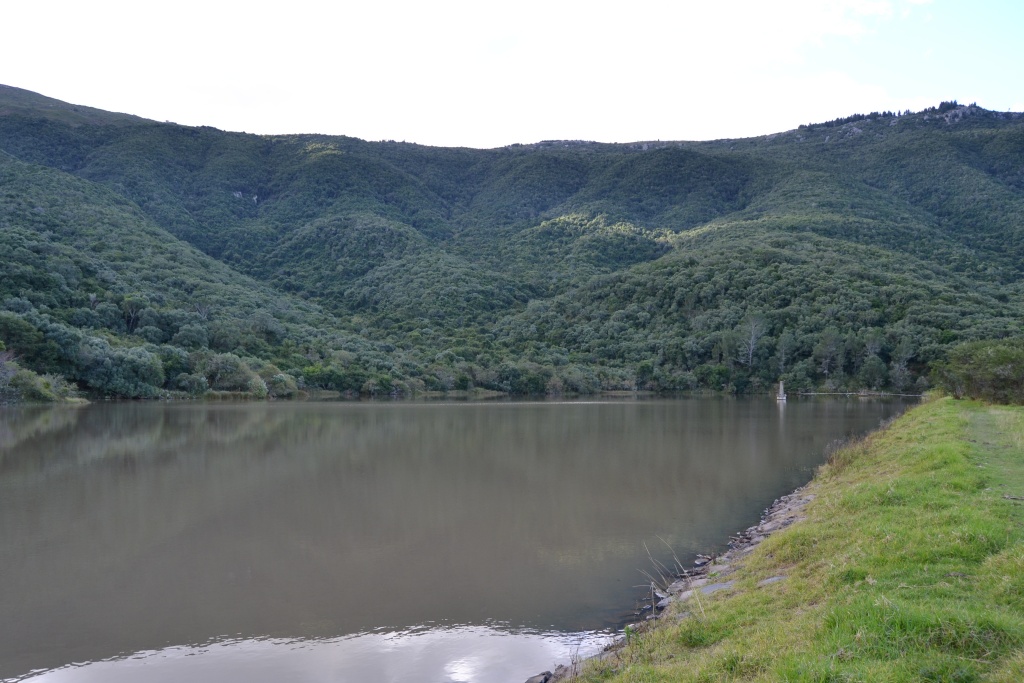 The route crosses along the dam wall with the view being the Boschberg mountain overhead and the forest coming right down to the water’s edge with the sound of wind in the trees and the stream flowing over the rocks. At the far end of the dam take the path east following the cascading stream down to where you cross over it.