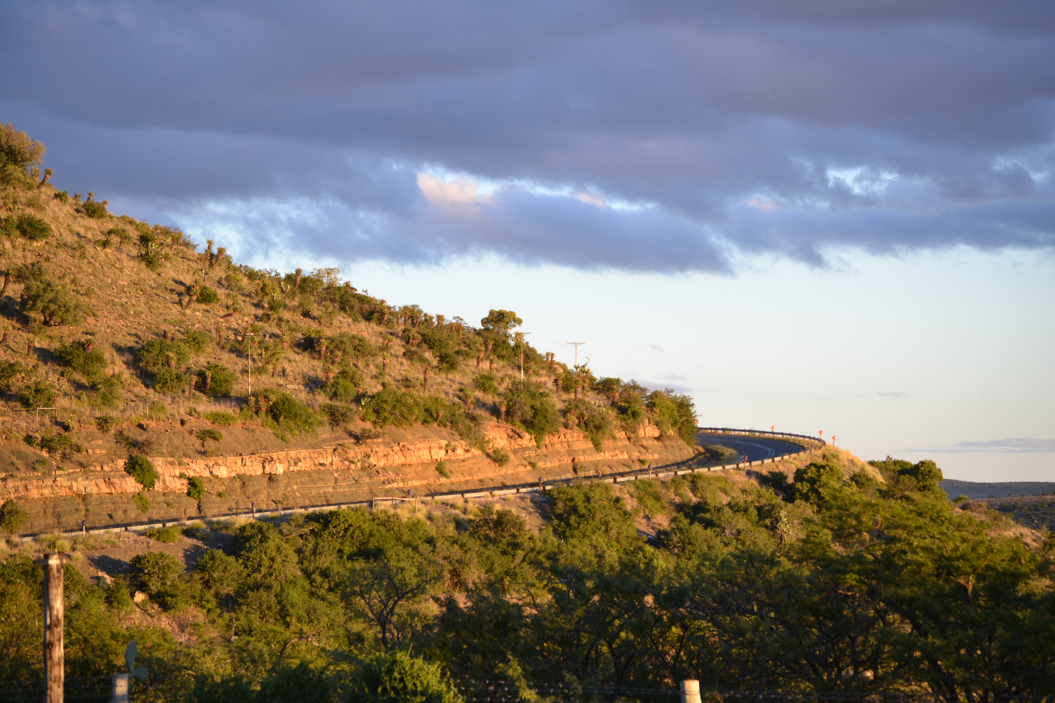 The Bruintjieshoogte Pass lies on the R63 road about halfway between Pearston and Somerset East. Most of the R63 traverses fairly flat terrain just to the south of a long line of mountains. Bruintjieshoogte is the first significant change in altitude after leaving Graaff Reinet on this road. This region is rich in game farms as can be evidenced by the many kilometers of game fencing on either side of the road.