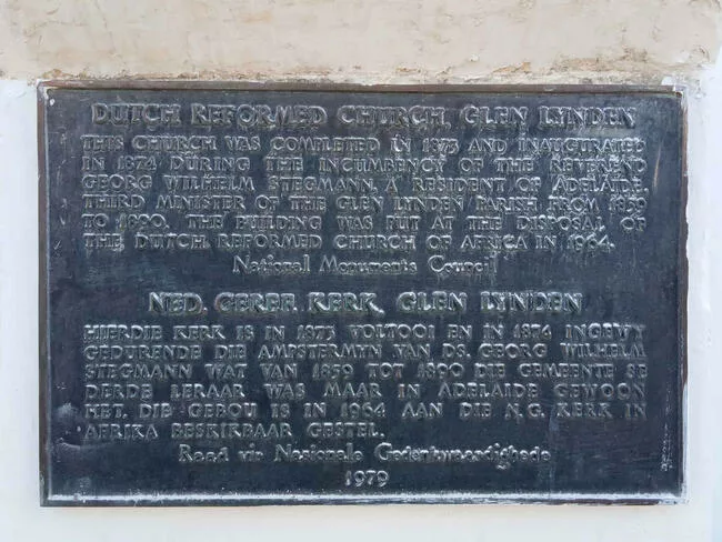 The Plaque on the “new” church of the National Monuments Council reads: “This church was completed in 1873 and inaugurated in 1874 during the incumbency of the reverend Georg Wilhelm Stegman, a resident of Adelaide, third minister of the Glen Lynden Parish from 1859 to 1890. The building was put at the disposal of the Dutch Reformend Church of Africa in 1964.”