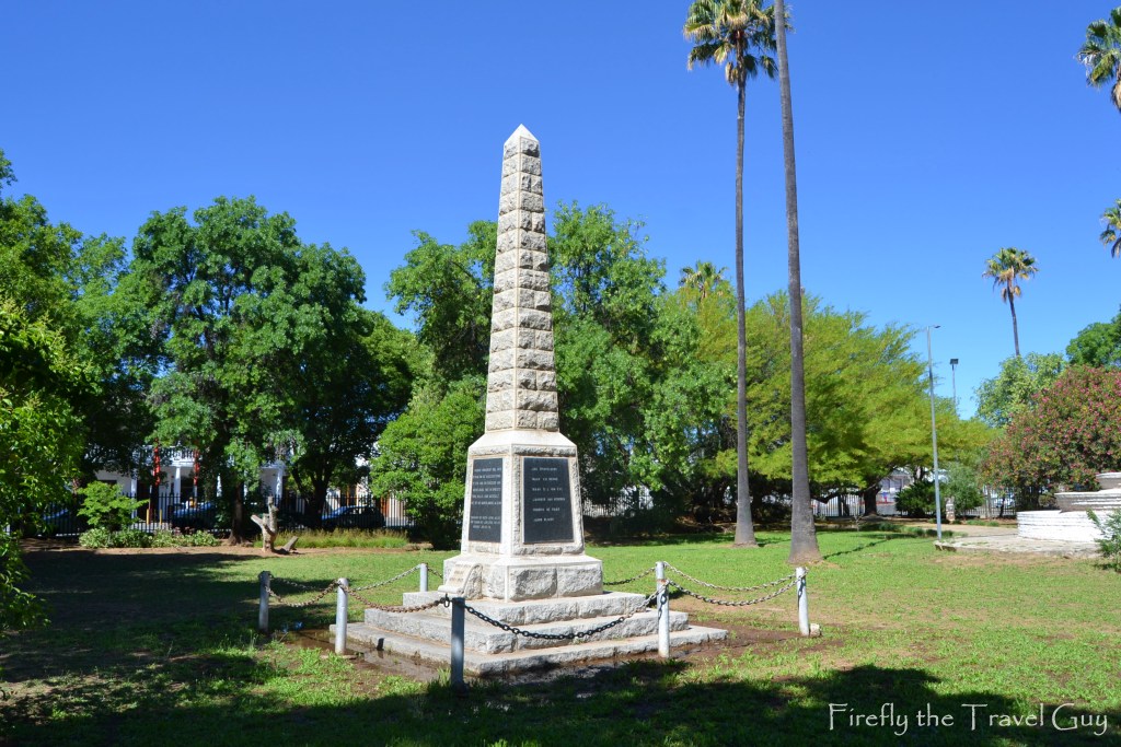 This graceful obelisk was erected in 1929 to honour the memory of 19 Burghers who fell during the Anglo Boer War.