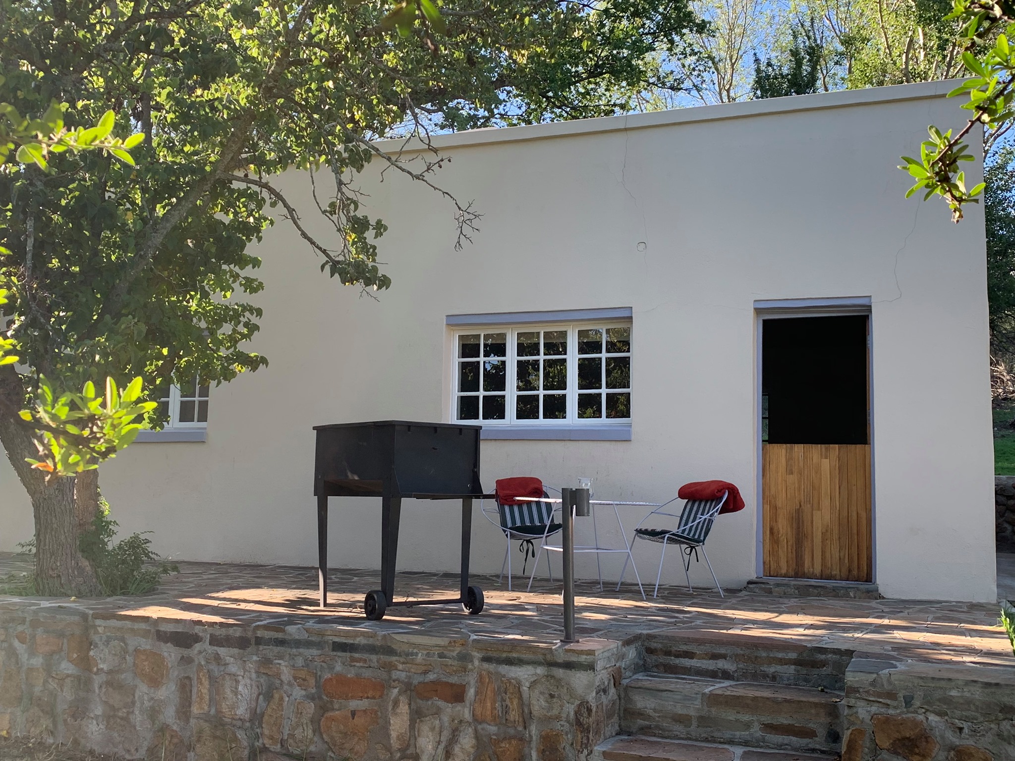 The cottage comprises of a bedroom with a queen bed and percale linen, an en-suite bathroom with shower and toilet, a lounge with open plan kitchenette and a fireplace making cold winter nights cosy and comfortable. The kitchenette itself is fully equipped with a microwave and gas hob. Braai facilities on the veranda make for enjoying memorable nights under the heavy star-laden skies with wood being provided. On hot summer days, a dip in the reservoir is the perfect way of cooling down. The cottage doesn’t have TV and wi-fi and therefore is ideal for couples who want to get away from it all to a place of tranquillity, peace and simple enjoyment. Only Vodacom reception is available.