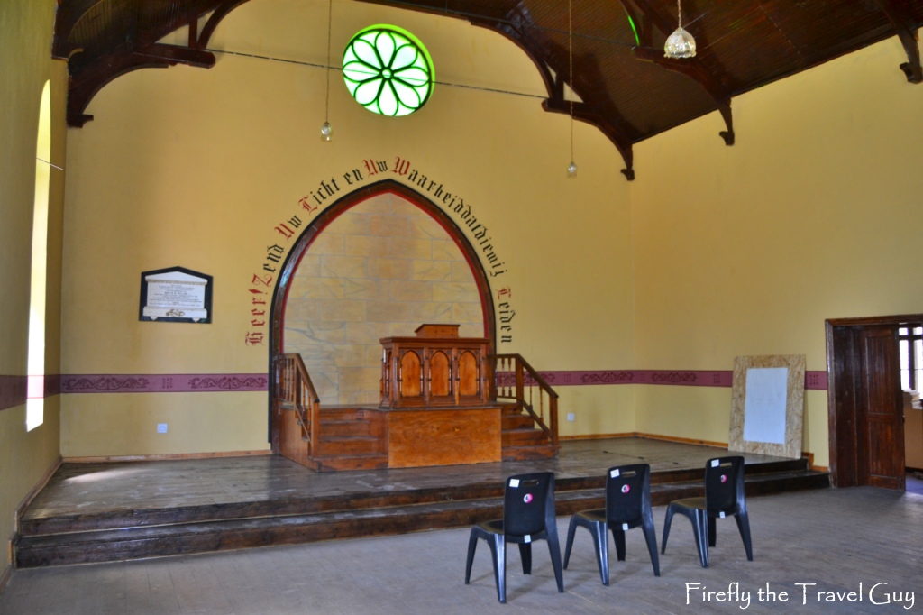 Robert Barry Taylor joined this community on 26 August 1848. Up until his arrival the school had doubled as a church, but he did not find this satisfactory and he motivated the community to collect funds and to build itself a church. This Neo-Gothic building with yellowwood doors was inaugurated on 24 July 1853. The church was a small scale a replica of the Harpenden Church in England. (although the chapel was described as: ‘an exact replica of the Harpenden chapel in England, this cannot be corroborated at present as the Congregational Chapel at Harpenden was demolished. This does however seem unlikely as this Gothic Revival structure forms part of the specific architectural expression of this movement found in the drier parts of South Africa and is a direct result of materials and skill available; a localised vernacular’.)