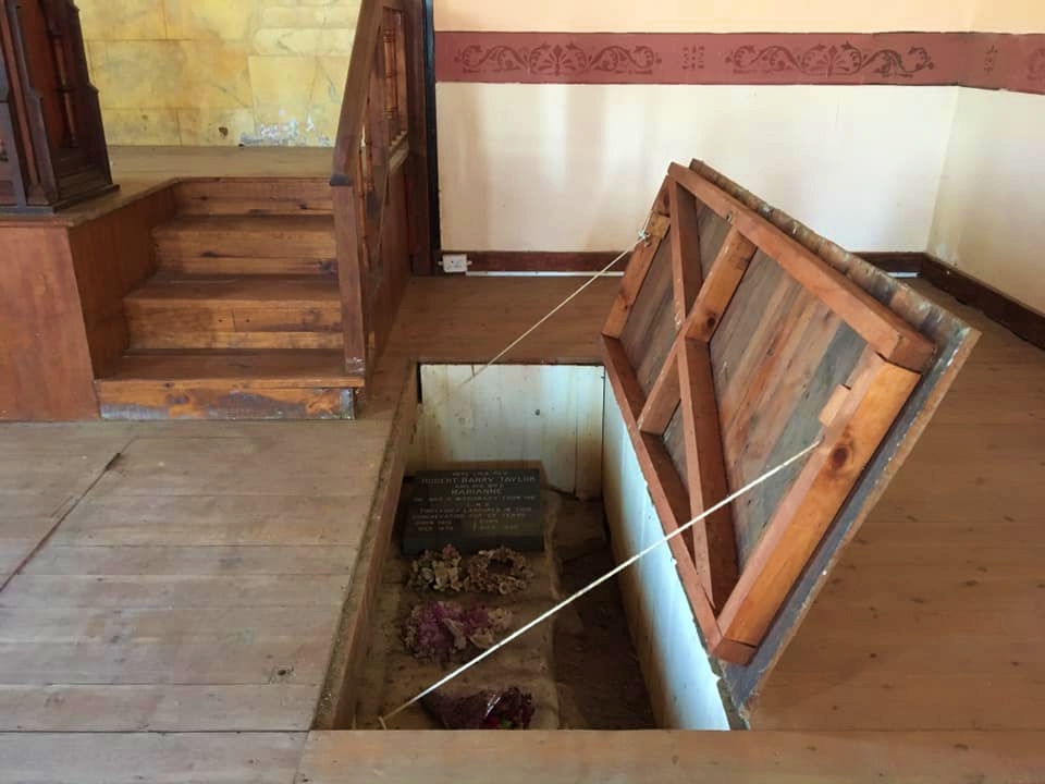 Undaunted, Robert Barry Taylor simply began raising funds again for restoration work. This time a front porch and clock tower were added. The church was enlarged during the time of Pastor J G Weis (1906–1914). In 1974, the building was seriously damaged in a flood, but the congregation leapt into action to rescue it. The congregation felt it owed a great deal to Rev RB Taylor and his wife, Marianne, so they buried them beneath the pulpit.