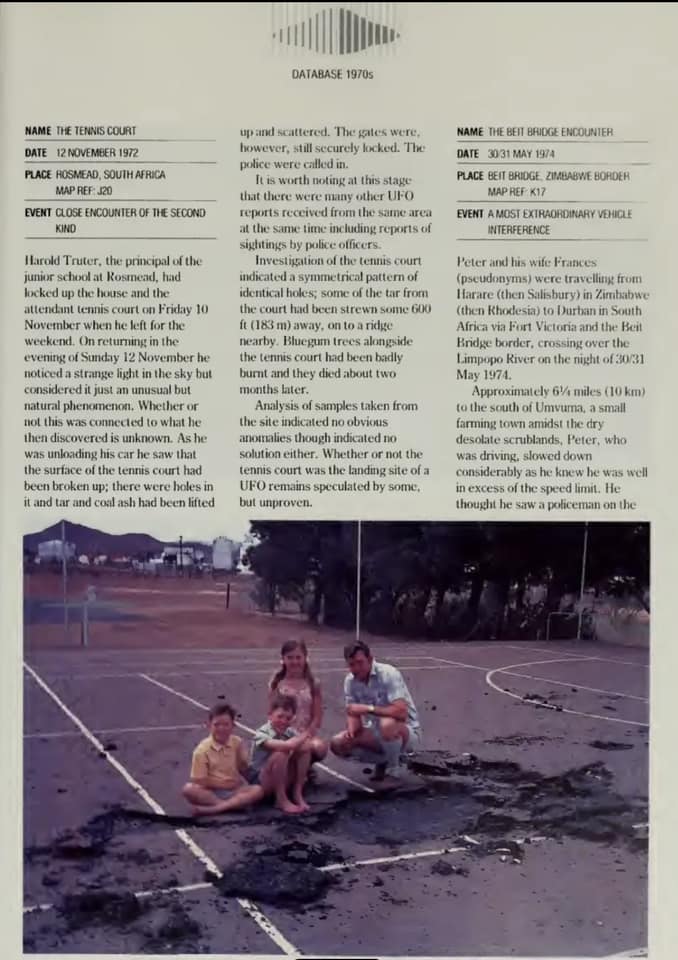 Closer investigations the next morning showed a number of scorch marks and holes in the tar of the tennis court. Nearby trees were burnt and died soon after and fragments of tar and rock were later found strewn as far as 200m away. It seems an alien craft could have hovered over Rosmead, landed briefly and then, using its afterburners, simply took off into the dark night again. The official word though is that it never happened and the damage was caused by vandals. Sounds a bit like the Roswell incident at Area 51 in the USA.