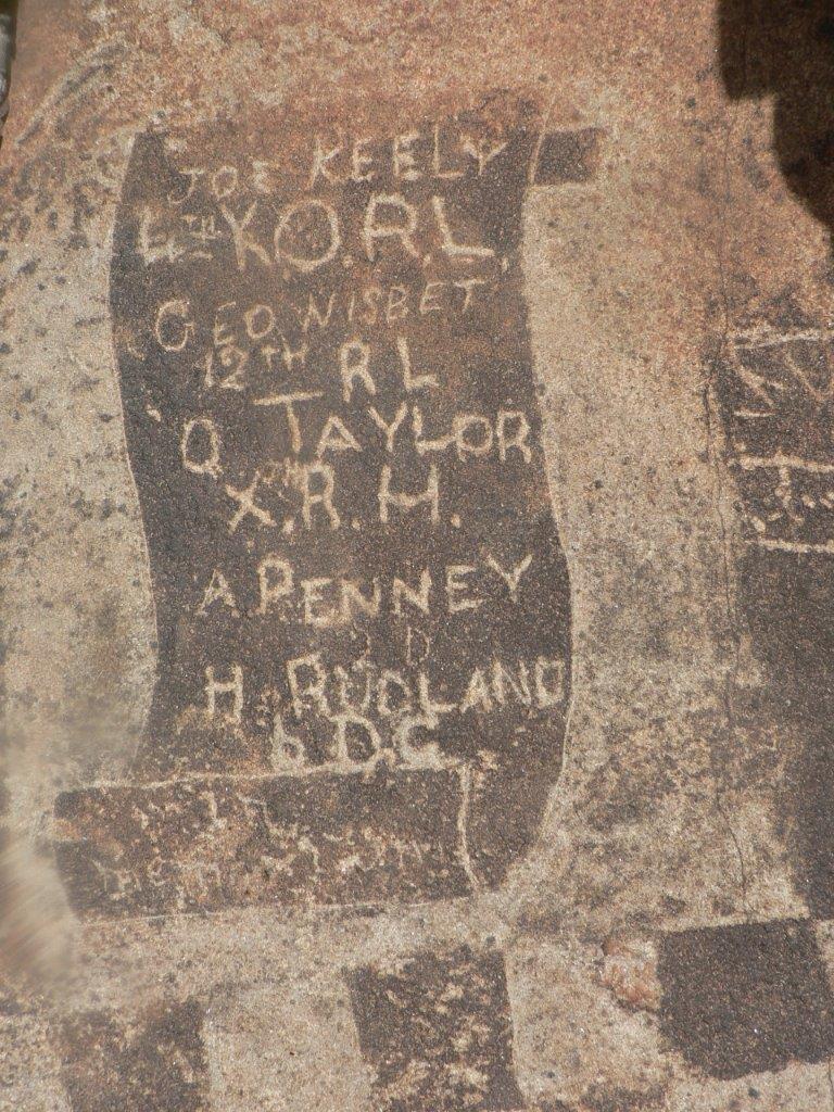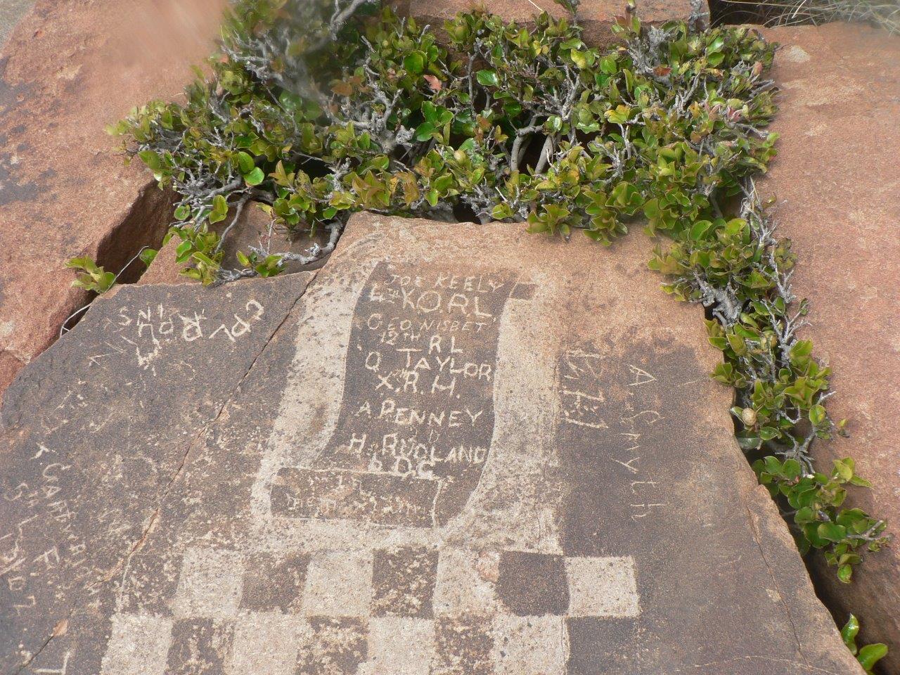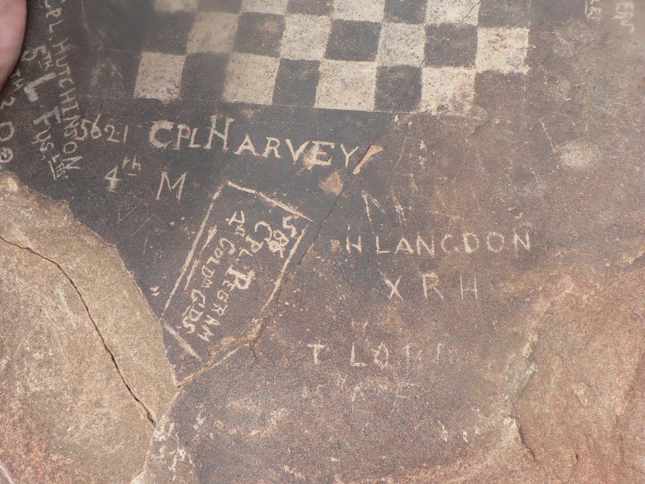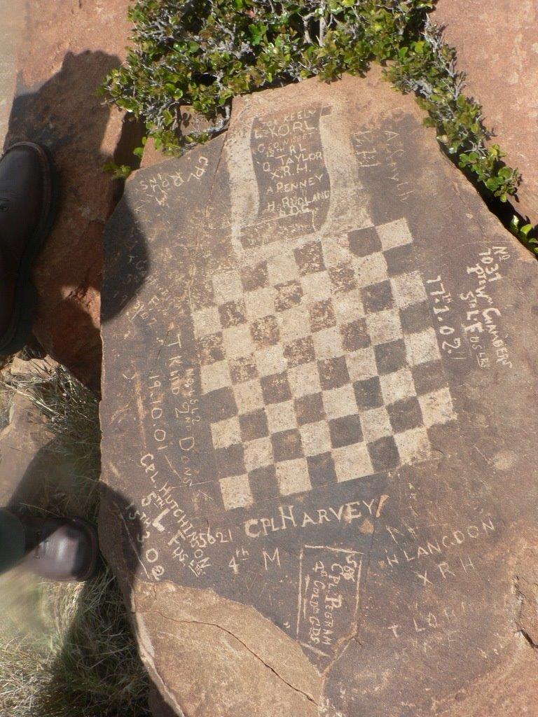 The chessboard and the names of the soldiers are etched onto a flat slab of rock at the top of Saltpeterskop. Names recorded include the 5th Lancashire Fusiliers, the Coldstream Guards and some privates, corporals and a captain.
