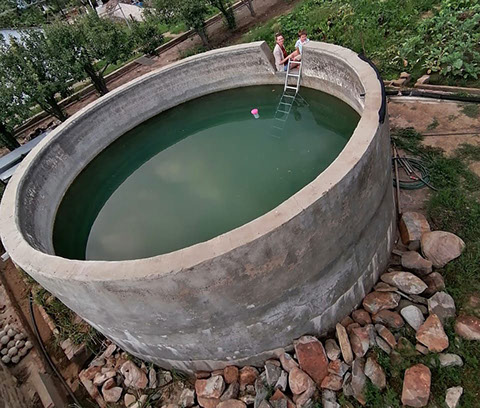– A swim dam with pool loungers and towels overlooking the vegetable garden