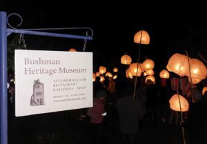 Each year, on New Year’s Eve (Ou Jaarsaand in Afrikaans), the Bushman Heritage Museum hosts the Festival of Lights. This festival is a joyful celebration, as hundreds of candle-lit lanterns wind up the hill from the Arts Centre and through the village. But it has a special meaning for us and the community as well.